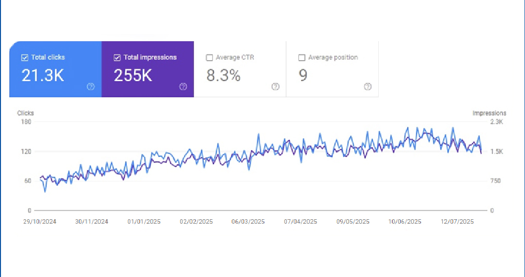 We partnered with Atech Products to strengthen its organic search presence and improve overall visibility in Google search results. Based on the performance data shown in the report, the website generated 21.3K total clicks and 255K total impressions, while maintaining an 8.3% average CTR and an average position of 9. Over the campaign period from October 2024 to July 2025, the site demonstrated a steady upward trend in both clicks and impressions. This project highlights how a consistent SEO strategy can improve search visibility, increase qualified traffic, and build long-term momentum in organic performance.